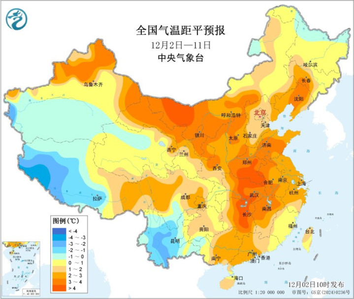 12月2-3日受寒潮过程影响,中东部大部地区气温下降6~10℃,局地降温10℃以上,黄淮以北大部地区气温较常年同期偏低2~4℃。4日后,影响我国冷空气势力减弱,我国大部地区气温将转为偏高。