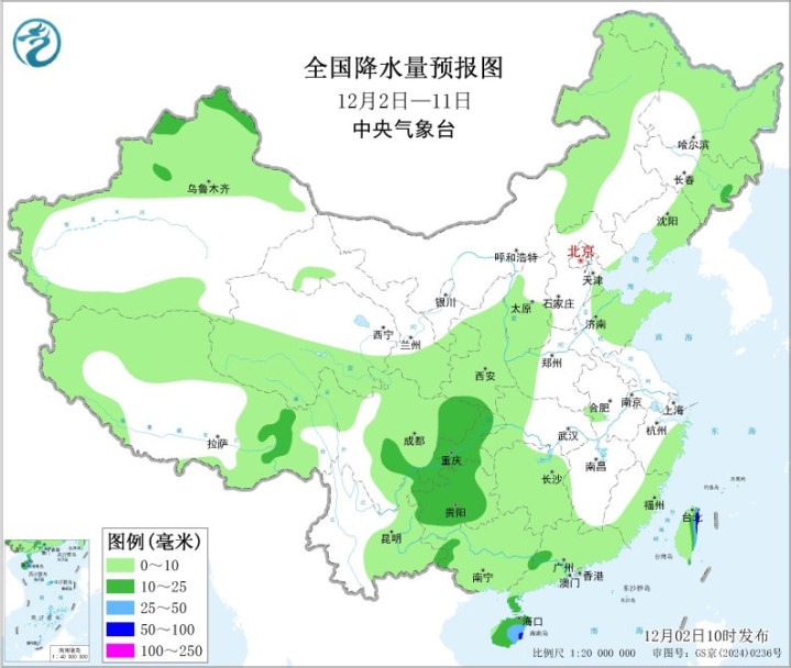 未来10天(12月2日-11日),我国大部地区降水稀少,新疆北部、吉林东部、四川盆地东部、贵州、广西西部、海南岛东部及台湾东部等地部分地区有10~20毫米,海南岛东部和台湾东部局地30~60毫米;除新疆北部和海南岛降水偏多外,我国其余大部地区降水均偏少。